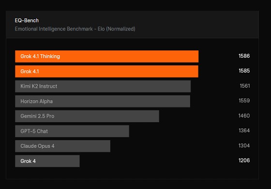 BREAKING: Grok 4.1 takes the top spot in the Emotional Intelligence Benchmark! 🧠✨ pic.twitter.com/psIMvaLJ0T