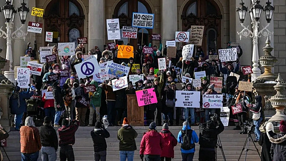 ミシガン州議会議事堂に100人以上の人々が集まって反対集会を実施