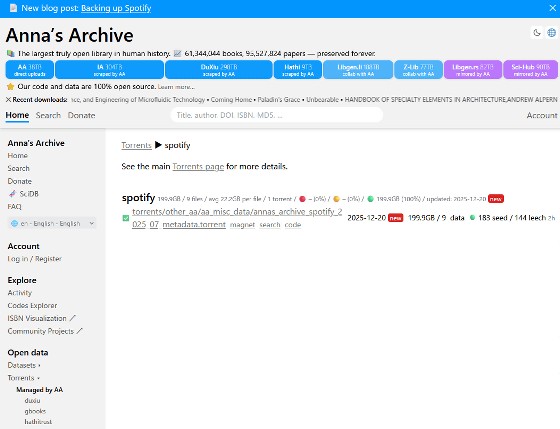 2025年12月、ネット上で大きな話題となったのは、海賊版サイト「Anna’s Archive」によるSpotifyからのデータスクレイピングだった。サイト側はSpotify上の2億5600万曲分のメタデータを取得し、既にそのメタデータを自由にダウンロード可能な形で公開している。そしてサイト側は約300TBに及ぶ楽曲ファイル本体の公開も順次進めていると発表した。 GIGAZINE+1