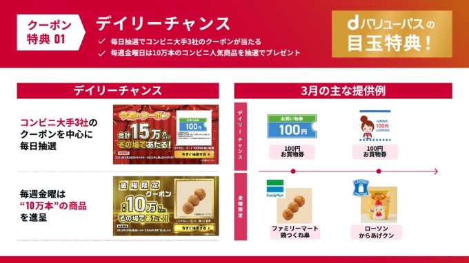 dバリューパスは、利用シーンの多さに力を入れており、コンビニエンスストアのクーポンが当たる「デイリーチャンス」の対象店舗も大手3社を対象にしている