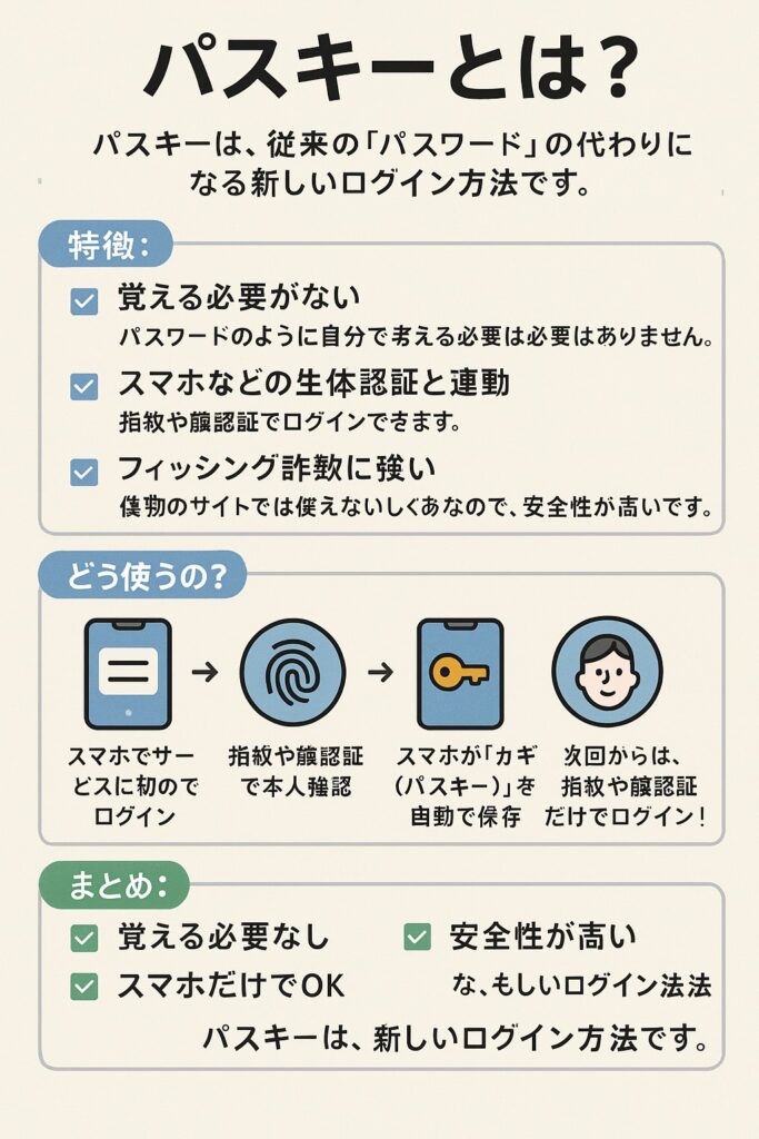 • パスキーは、そうした弱点を構造的に排除し、「使いやすさ」と「安全性」を両立する新しい認証方式です。
